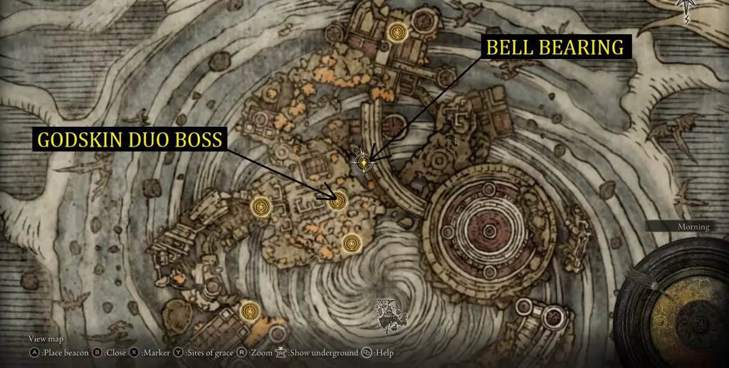 You will find Somberstone Miner’s Bell Bearing [3] on the northwest side of the First Church of Marika in the Mountaintops of the Giants as shown in the picture below.