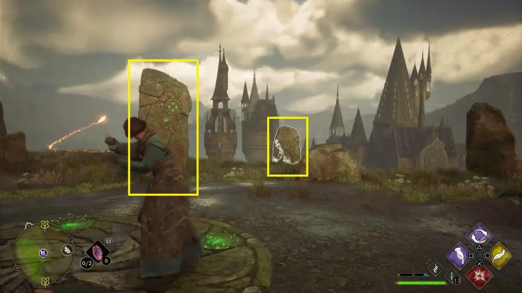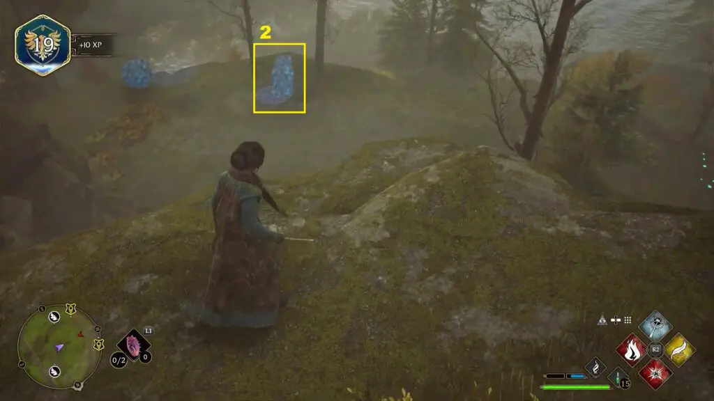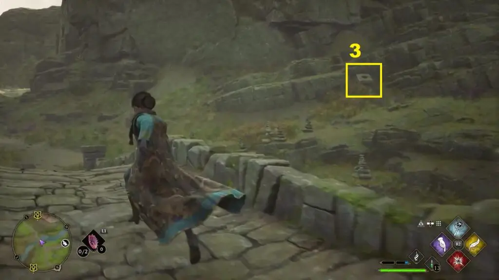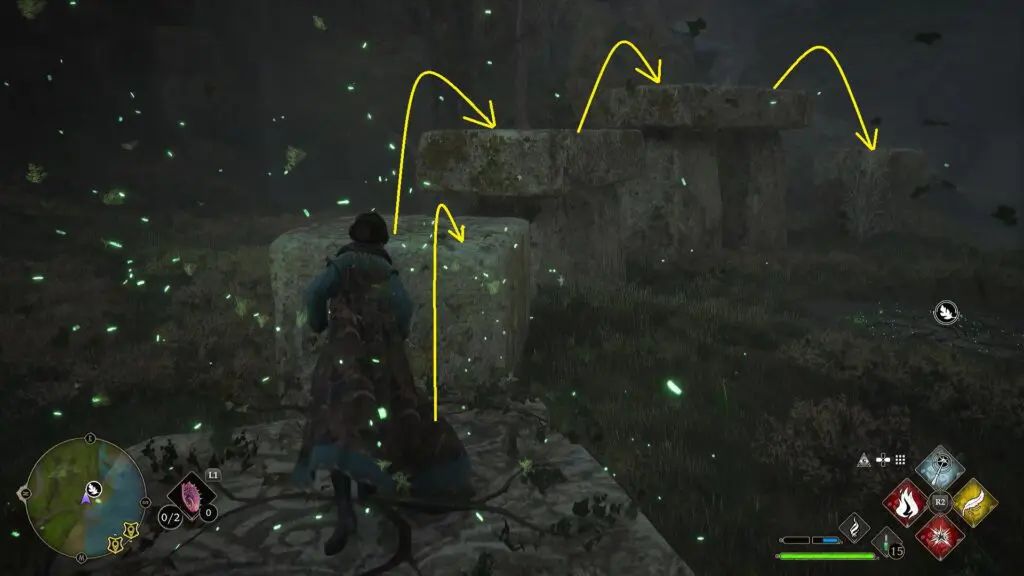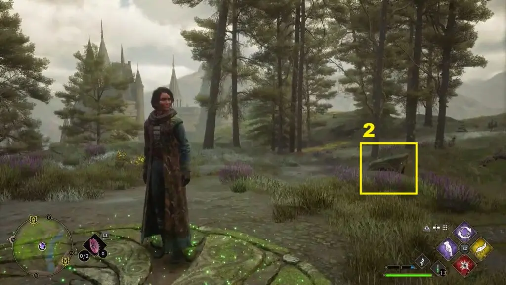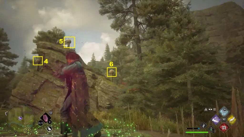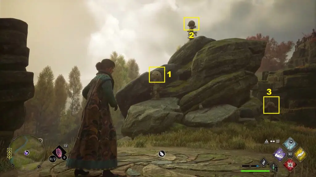 After using the Mallowsweet, three giant stone pillars will activate on the west side. The giant stones have moonlight gems inside them. You will also find clusters of butterflies in the area. Go near the butterflies and use the Lumos spell, which will make them follow you. Take them to the giant stone pillar, which will light it up. Light up the three giant stone pillars to complete the Merlin Trial. After the trail starts, jump down the mountain on the west side to find the first stone pillar. Then go further west towards west to find the remaining two stone pillars as shown in the pictures below.