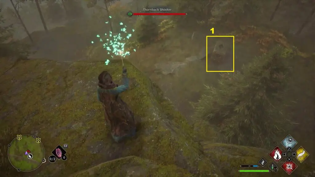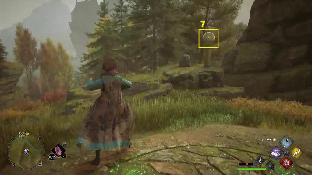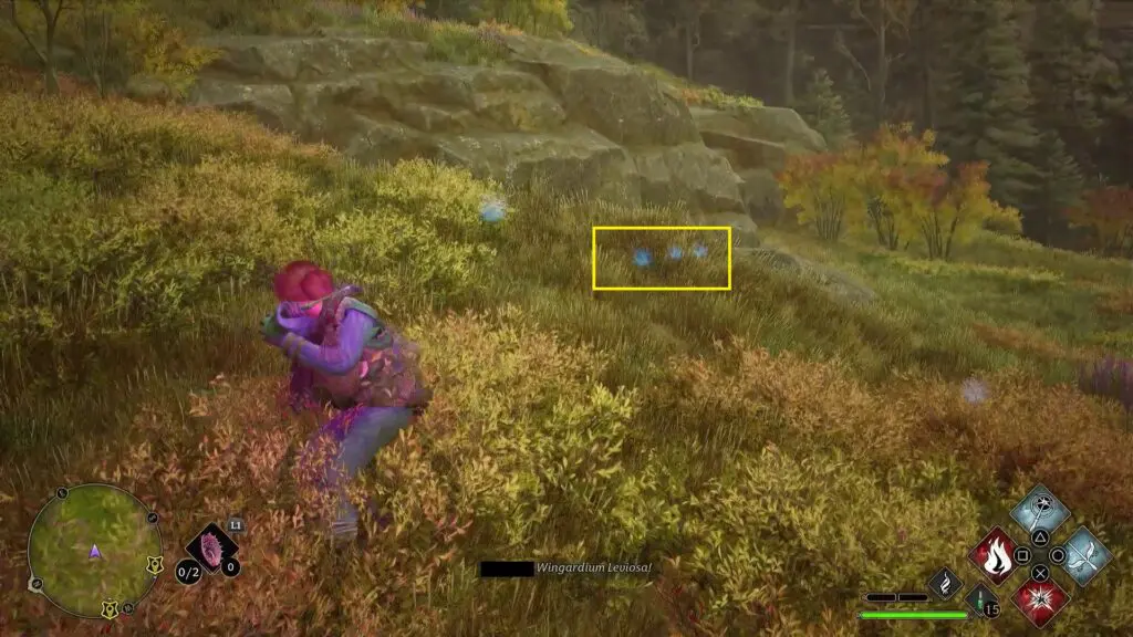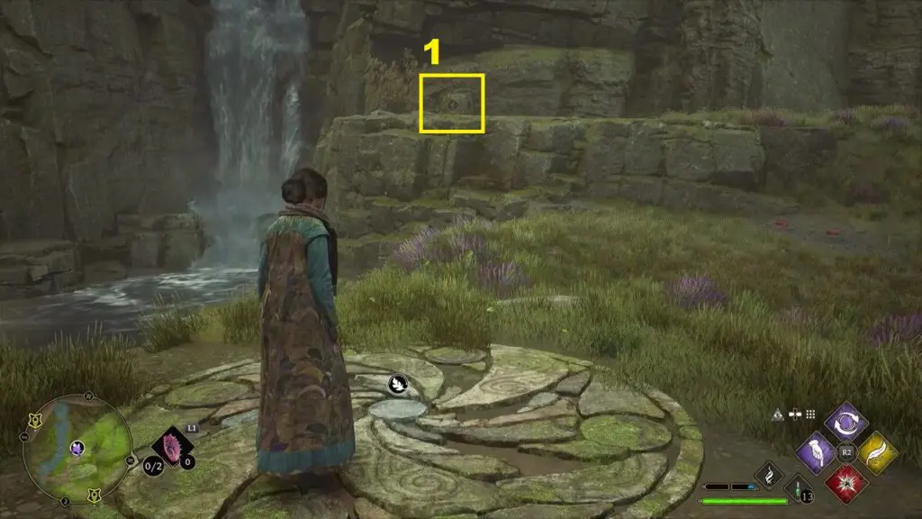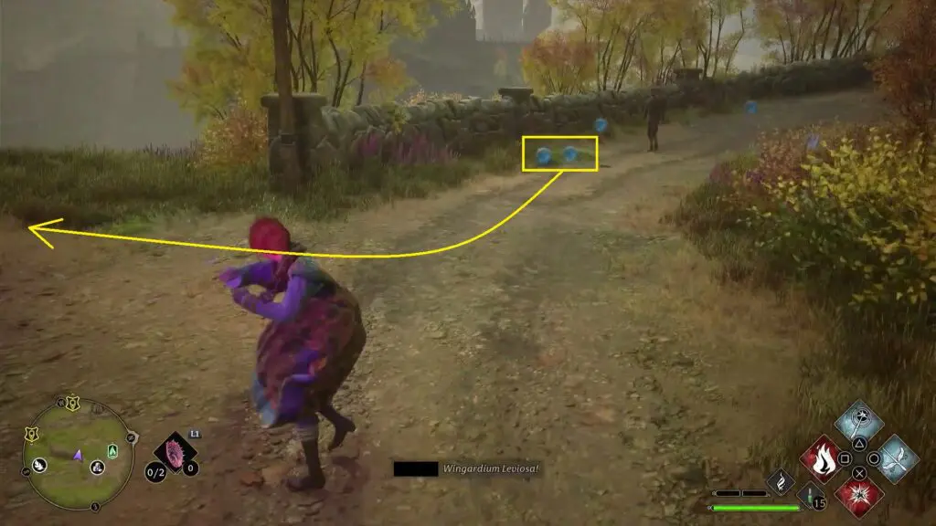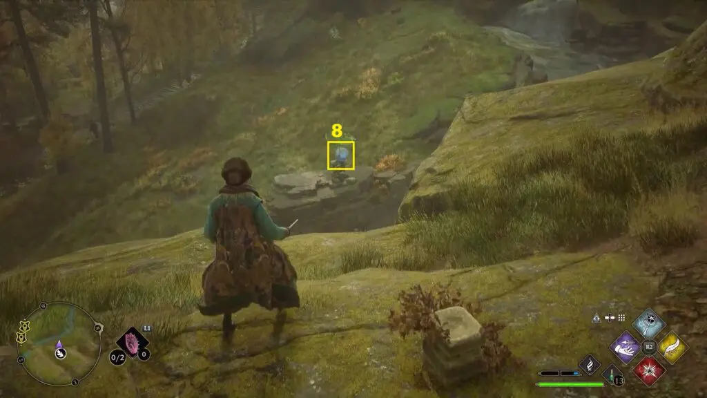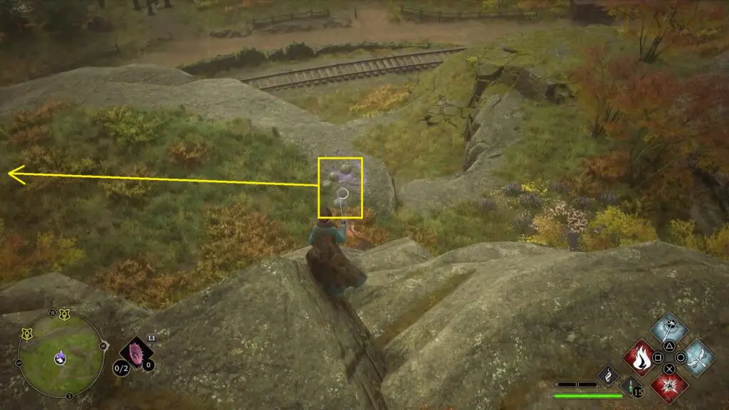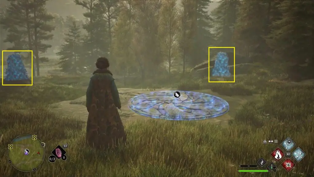 After using the Mallowsweet, three giant stone pillars will activate on the west side. The giant stones have moonlight gems inside them. You will also find clusters of butterflies in the area. Go near the butterflies and use the Lumos spell, which will make them follow you. Take them to the giant stone pillar, which will light it up. Light up the three giant stone pillars to complete the Merlin Trial. After the trail starts, jump down the mountain on the west side to find the first stone pillar. Then go further west towards west to find the remaining two stone pillars as shown in the pictures below.