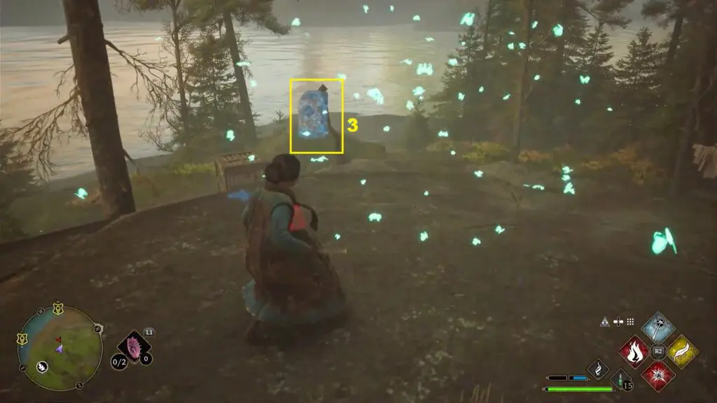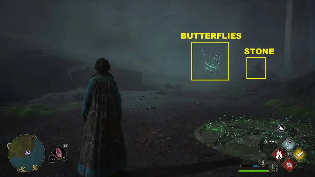 After using the Mallowsweet, three giant stone pillars will activate in the area nearby. The giant stones have moonlight gems inside them. You will also find clusters of butterflies in the area as shown in the second picture below. Go near the butterflies and use the Lumos spell, which will make them follow you. Take them to the giant stone pillar, which will light it up. Light up the three giant stone pillars to complete the Merlin Trial. One of the butterfly clusters and stone is near the shore. Use Revelio, if you are unable to find it.