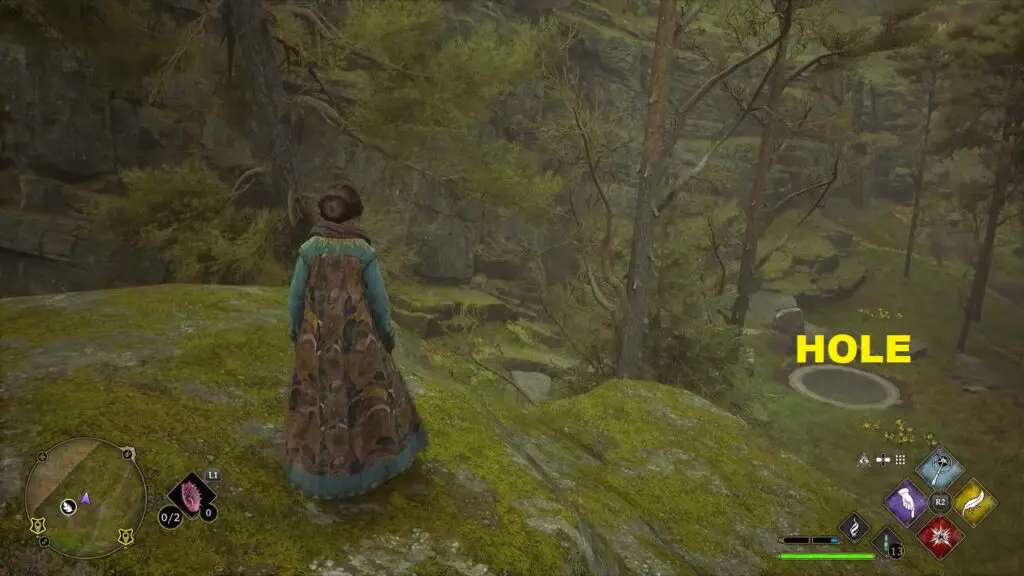After using the Mallowsweet, Climb up the mountain on the north to reach the giant ball. Look down on the north side and you will see a giant hole in the ground as shown in the second picture below. Now use Accio and Depulso spell to push down the giant stone and guide it to the hole to complete the trial.
