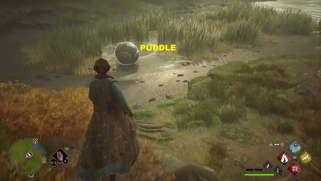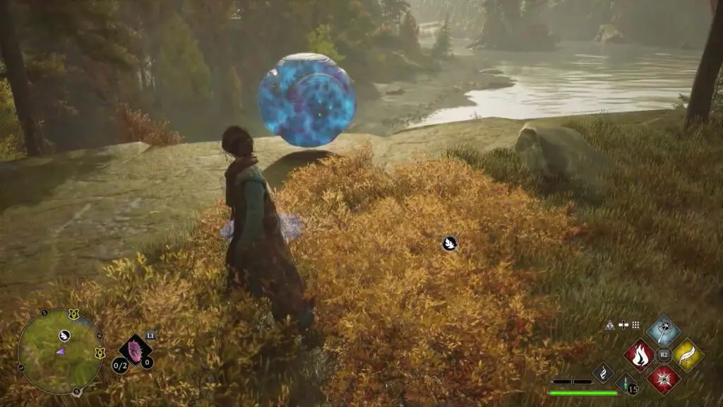 To solve the puzzle, you need to move the ball into the giant hole in the ground near the river as shown in the second picture below. First, use Leviosa spell to lift the giant stone ball in the air as shown in the picture below. Then move towards the hole and use the Accio spell to summon the giant stone towards you. Now guide the giant stone into the hole while using Accio. The trial completes when the giant stone ball drops into the hole.