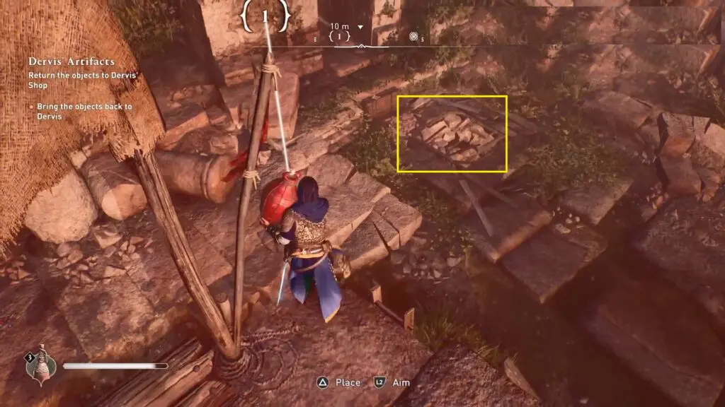 Use the ladder to climb atop the ruins. Grab a red explosive vase and throw it at the destructible floor on the ground. This reveals the hidden book.