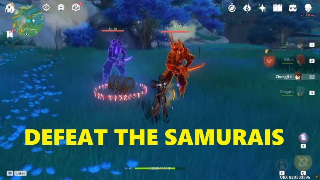 To de-electrify all the swords you have to touch the swords (interact with the swords) in the right order as shown by the Seelie. As you approach the swords you will see a Seelie flying from one sword to another in a particular order. Stand still and observe the Seelie for a while and carefully notice the pattern in which it’s touching the swords. You’ve to touch the swords in the same pattern. The images below show the correct order in which you’ve to touch the swords. Touching the swords in the correct pattern will de-electrify the swords and two samurais will appear. Defeat the samurais and grab the content of the luxurious chest.