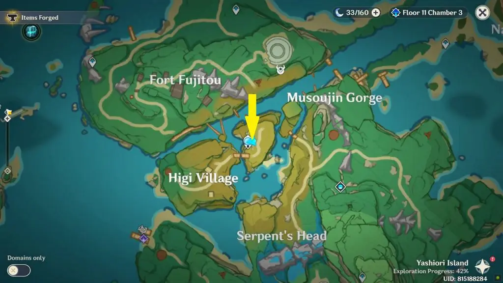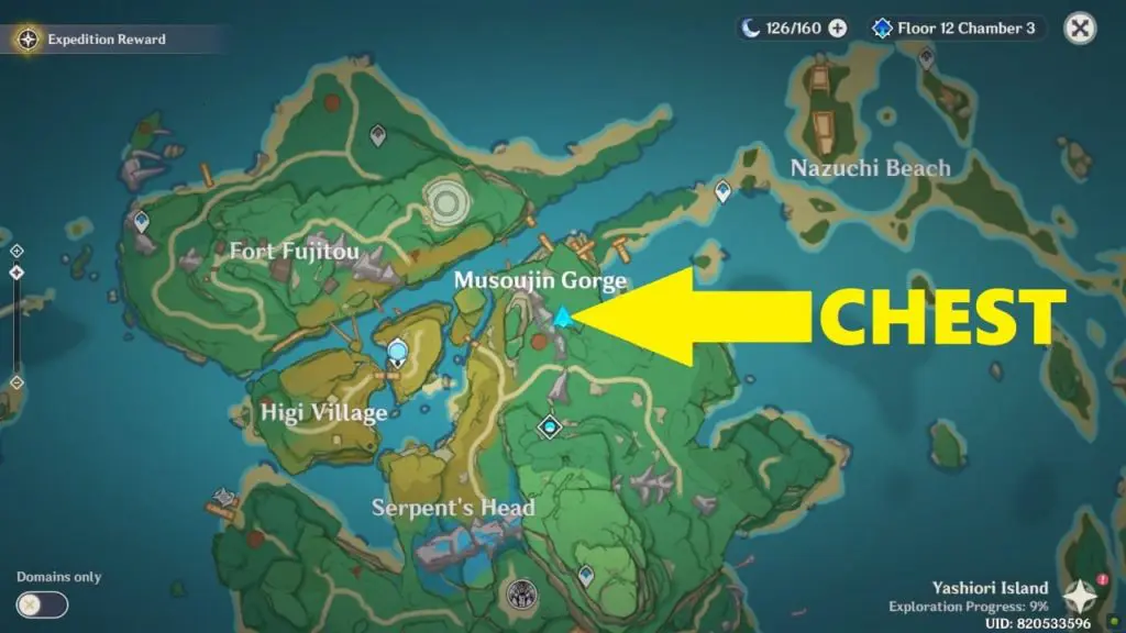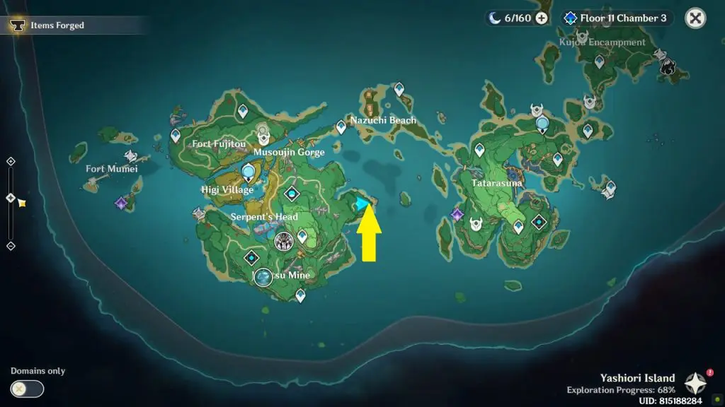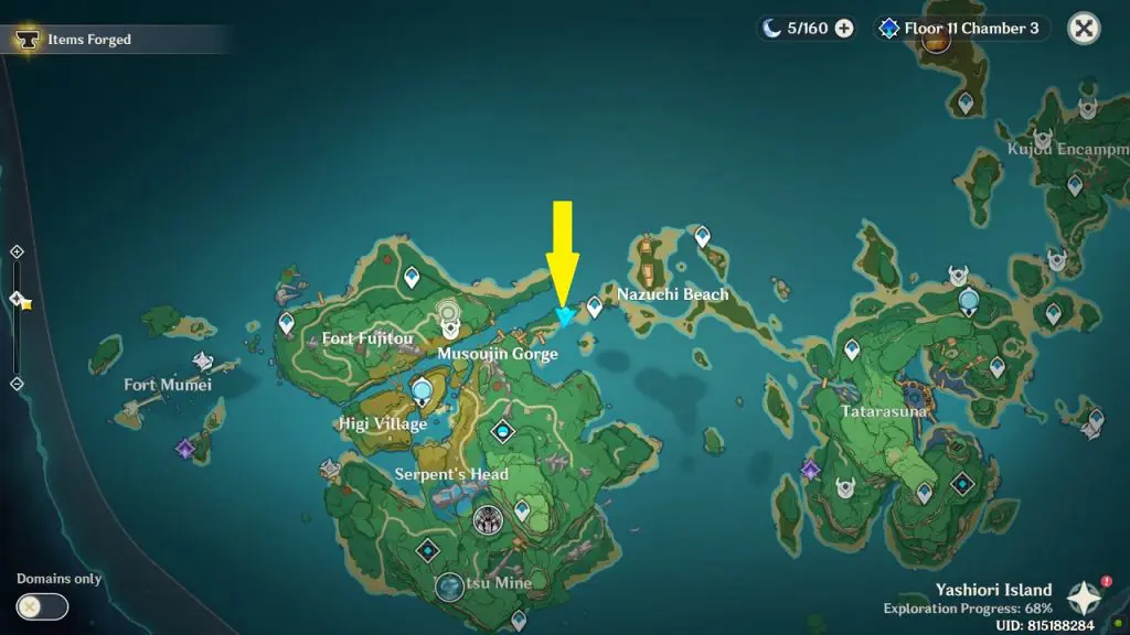 One Sword Hilt is in Nazuchi Beach, which is on the northeast side of Yashiori Island. The sword hilt is at the location as shown in the picture below. Summon electrogranum from the plant near the Sword Hilt and then touch the sword hilt to make an Elite Samurai appear. Defeat the samurai and a common chest will appear.