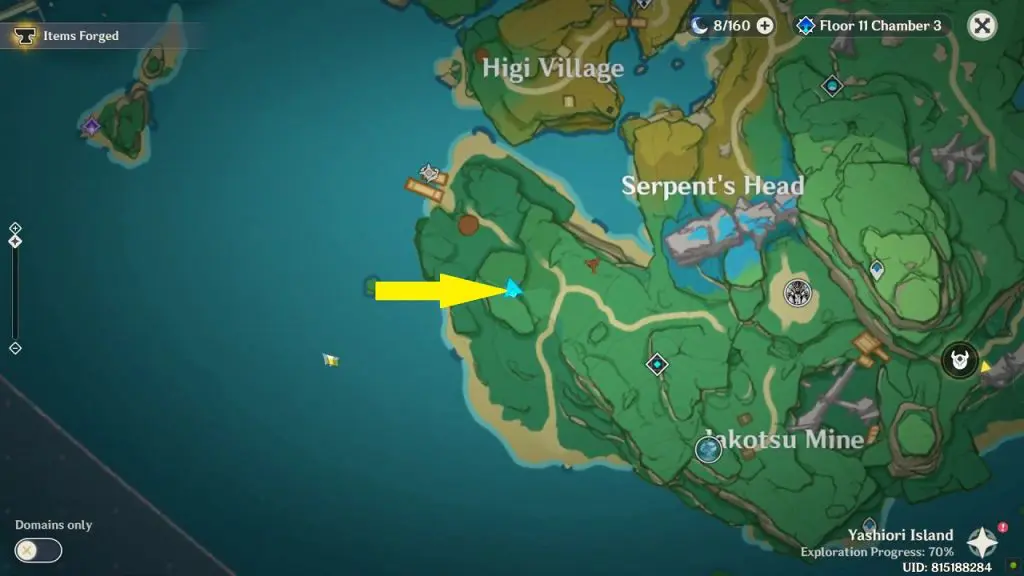 One Sword Hilt is on the beach on the eastern side of Yashiori Island. The sword hilt is at the location as shown in the picture below. Summon electrogranum from the plant near the Sword Hilt and then touch the sword hilt to make an Elite Samurai appear. Defeat the samurai and a common chest will appear.