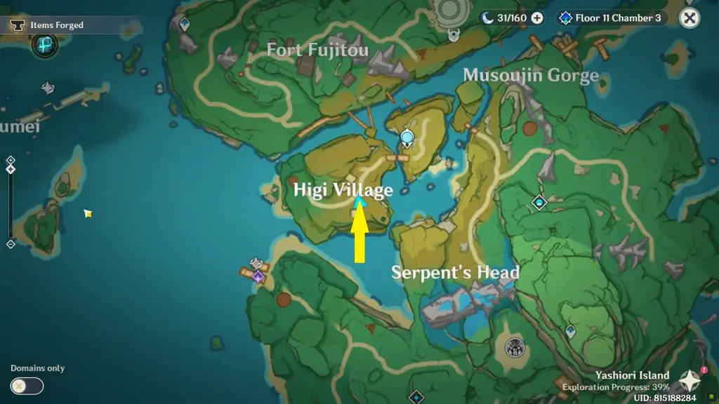 The Sword Hilt is in Higi Village, at the location as shown in the picture below. Summon electrogranum from the plant near the Sword Hilt and then touch the sword hilt to make an Elite Samurai appear. Defeat the samurai and a common chest will appear.