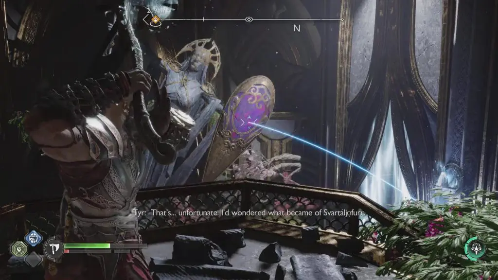 Destroy the green stone on the left side of the room as shown in the picture below. Then wait for Tyr to climb up the twilight stone and position it correctly. Then throw your axe at the twilight stone at an angle shown in the picture below. This will make the axe hit the white crystal powering the door.