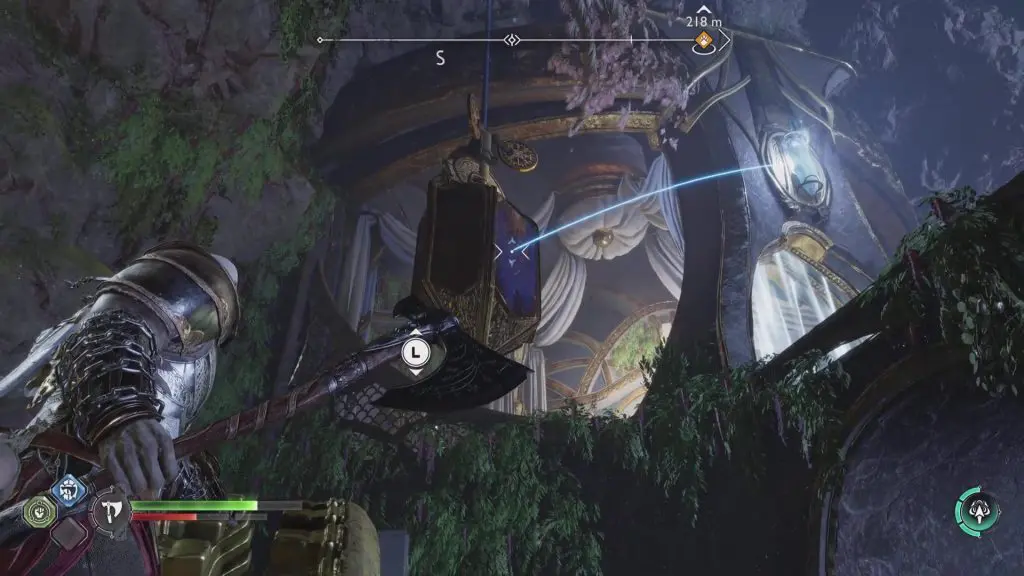 Move the hanging plate to the left. Then, move the hanging plate to the right. While it is swinging to the right, take out your axe and position it appropriately as shown in the second picture below, as the plate won’t stay there for very long. When the plate is at the correct position, hit the purple twilight stone with your axe such that the axe deflects and breaks the white crystal powering the door.