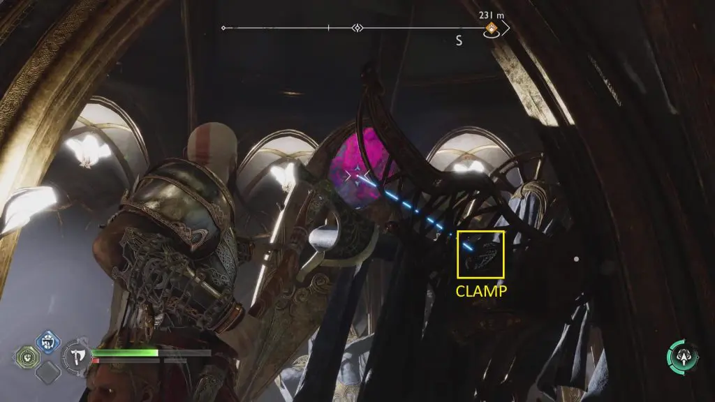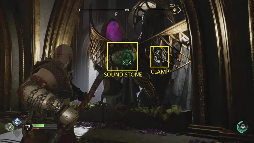 Now climb up the wall behind the tilted statue and go right. Then use the grapple to swing to the platform on the left side of the room. Now go behind the second statue and destroy the green sound stone as shown in the picture below to tilt the statue. Then destroy the clamp on the statue as shown in the picture below. This will destroy the right wing, making the statue tilt further to the right.