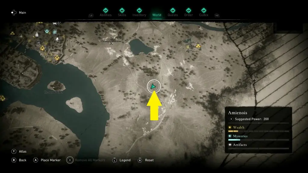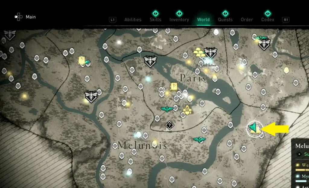 Treasure the ‘Melun Hoard map’ leads to is in Amienois area at the location as shown in the picture below. The treasure that you get is ‘Ouroboros Scheme (Back)’.