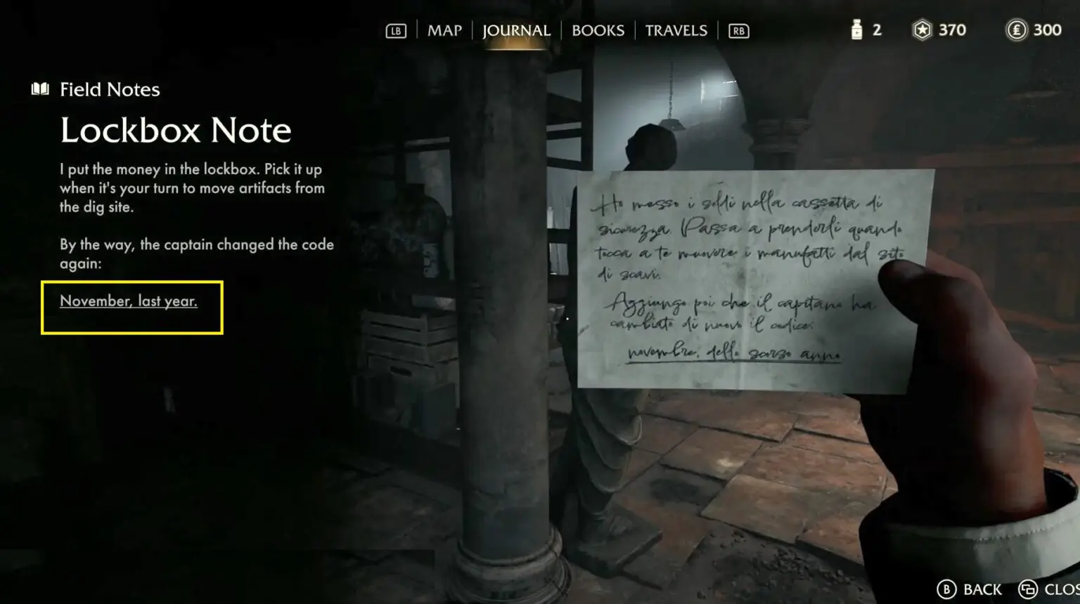 This safe is available during the ‘A Savage Discovery’ Fieldwork Side Quest. In this fieldwork, you’ll head to the excavation site, where you can get the Cellar Key by defeating an enemy. Once you have the key, use it to unlock the door under the post office. Inside take out the guard to find a note. The note talks about November from last year. Since November is the 11th month and the last year was 1936, the safe code is 1136.