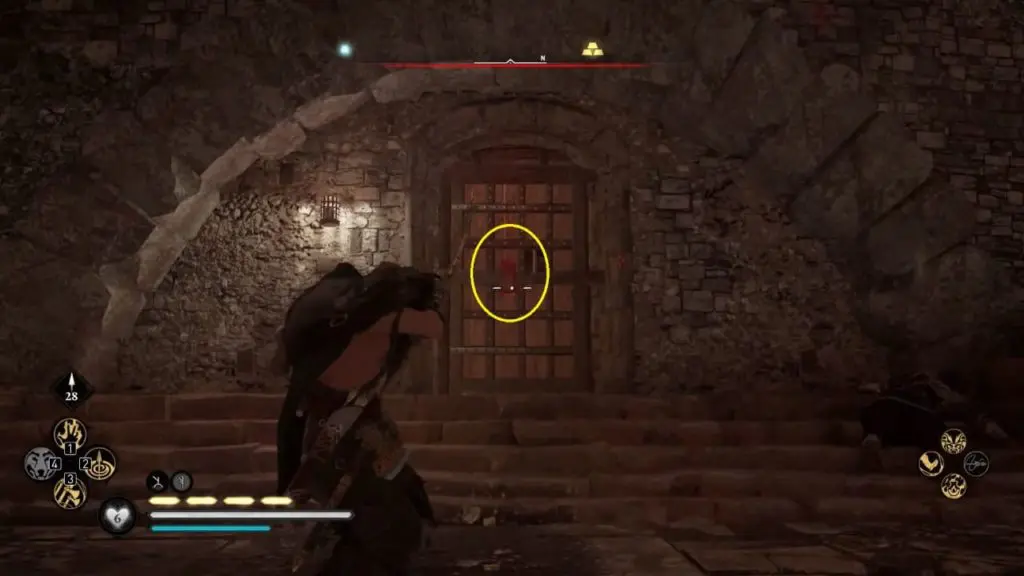 - Go along the left of the main chapel to the doorway that’s closed with a steel grate.
