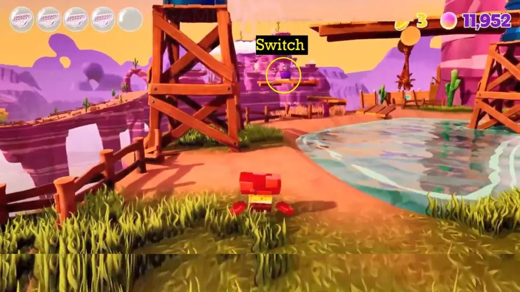 This location is at the same location where you get the objective “Follow Mrs. Puff”. Using the jumping pad, climb to the top of the platform. Press the purple switch and pass through the rings of fire. In the end, defeat all enemies. You’ll be transported back to the switch that contains the coin.