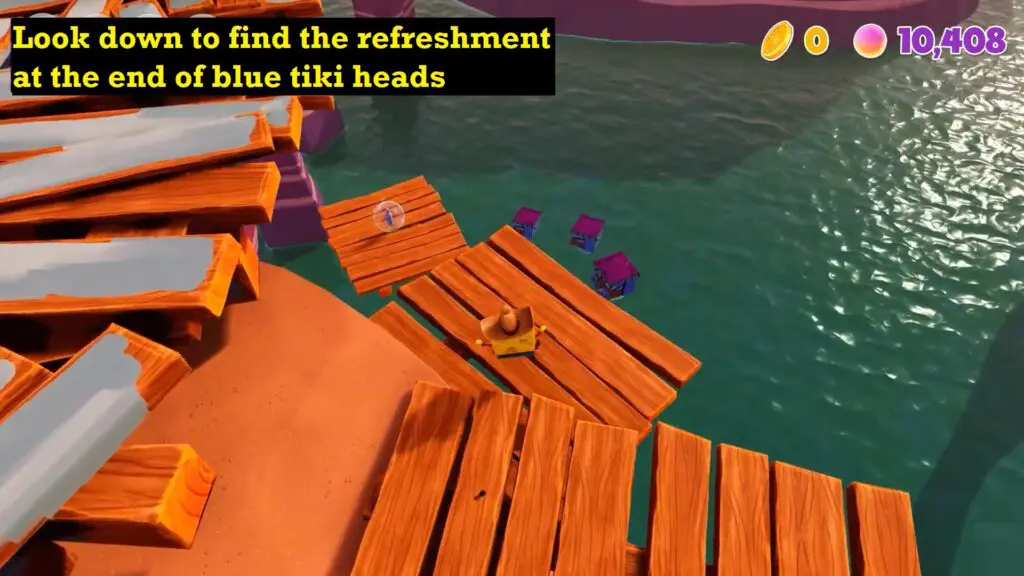 After reaching the Canteen Hills, head to the right toward the wooden platform leaning out. Look down to find the refreshment at the end of the blue tiki heads.