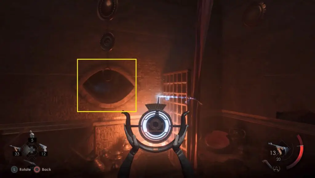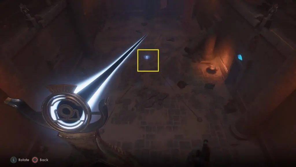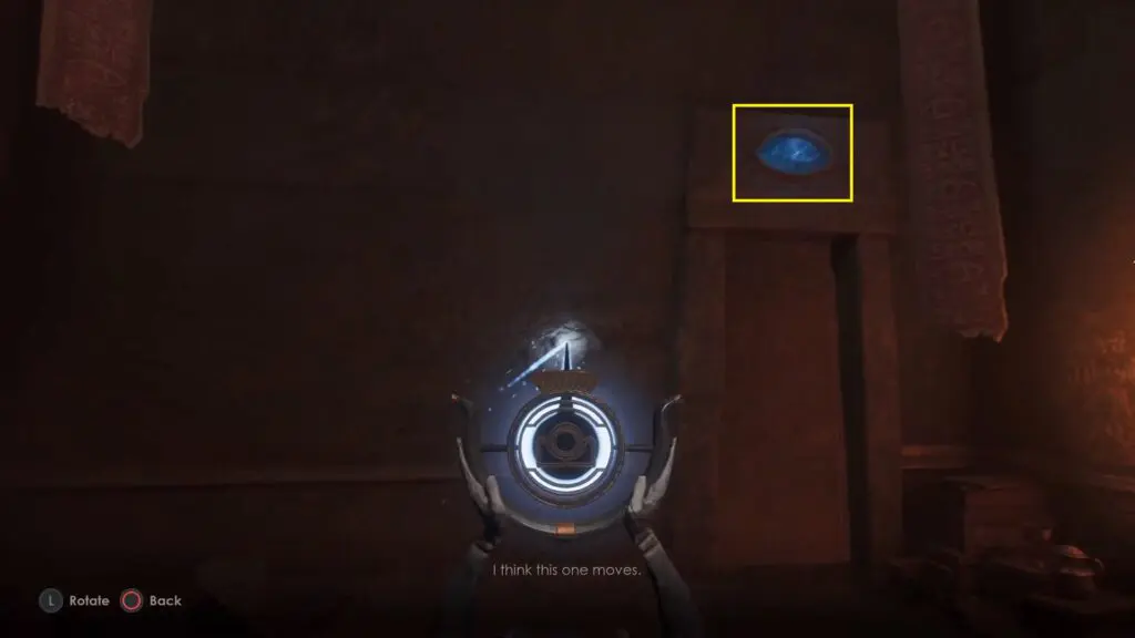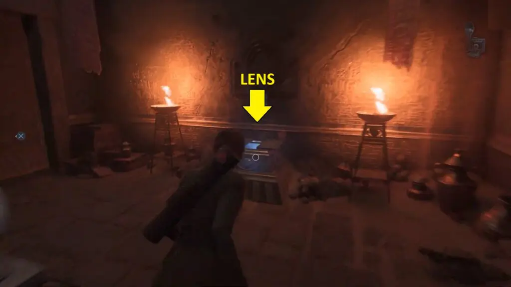 Enter into the door and continue following the path until you reach a room with a statue and a chest. Collect the lens from the chest and place it on the statue.