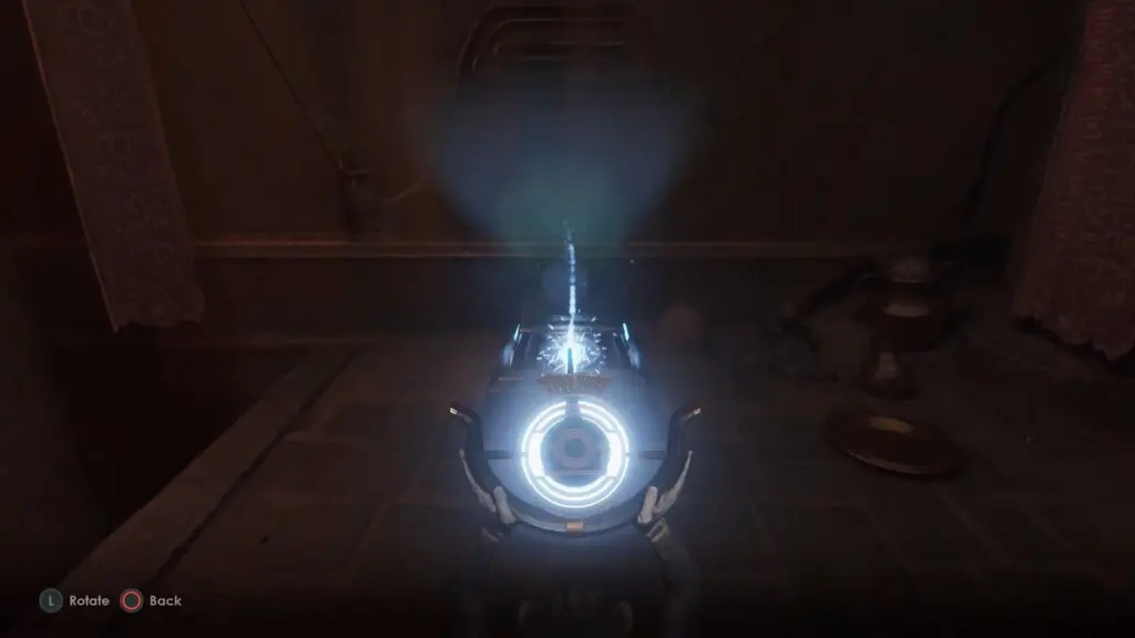 Exit the room and proceed to the adjacent room. Move the light beam on the chest to unlock it and retrieve the third lens.