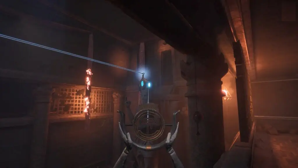 Break past the barrier and enter the room. Activate the lever and guide the light beam towards the eye.