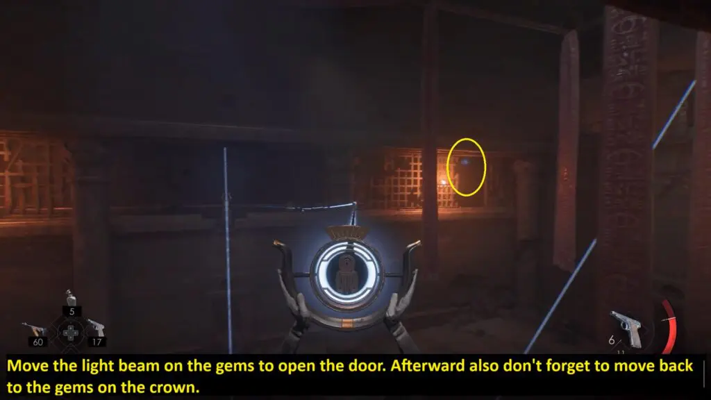Activate the lever located near the entrance and move the beam of light to the blue gem to open the door to the next area.