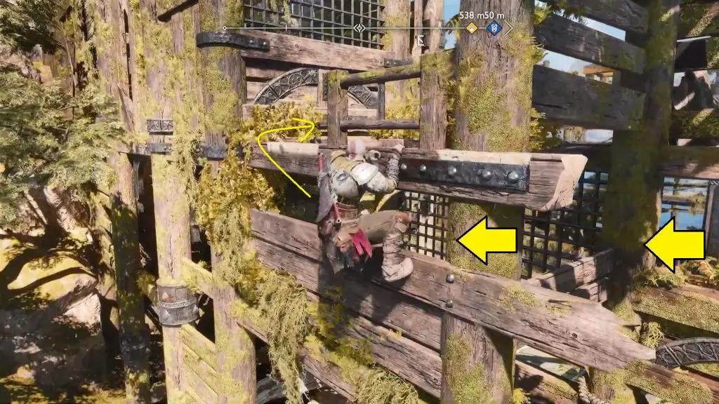 Climb up on the wooden wall in the left corner. Go around the wooden structure by following the white climbing path signs until you reach a platform.
