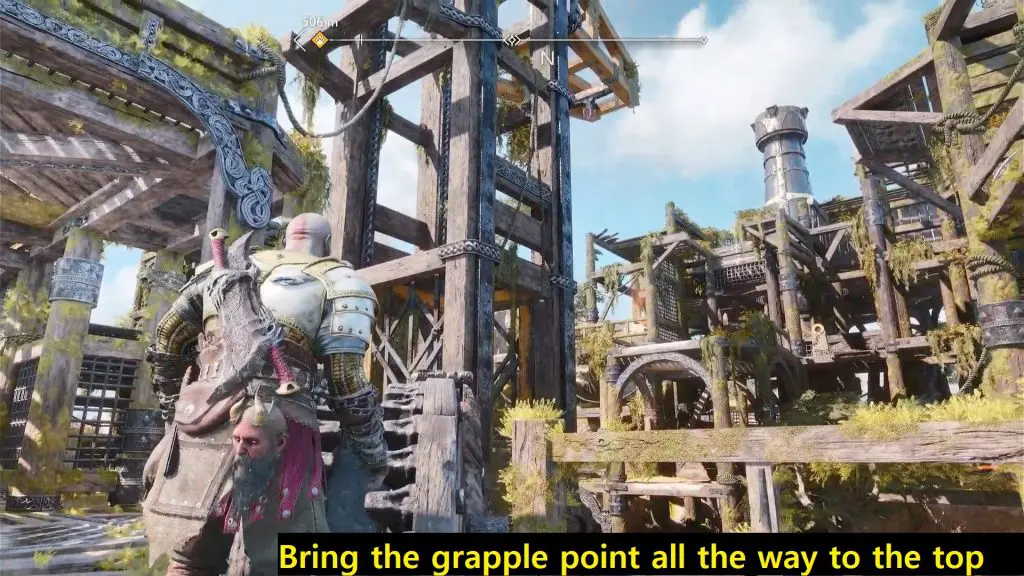 Interact with the giant wheel to drop the grappling point one level above the ground. (Position #3 as per image)