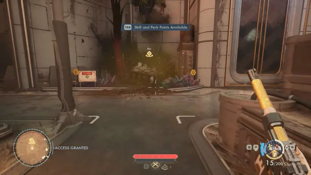 Head to the contaminated building nearby and locate the Zyranium leak along the outer wall. You’ll notice a faint, glowing gas cloud escaping from a pipe or vent. Step carefully into the gas cloud, and when prompted, use the Zyranium Collector to gather the sample.