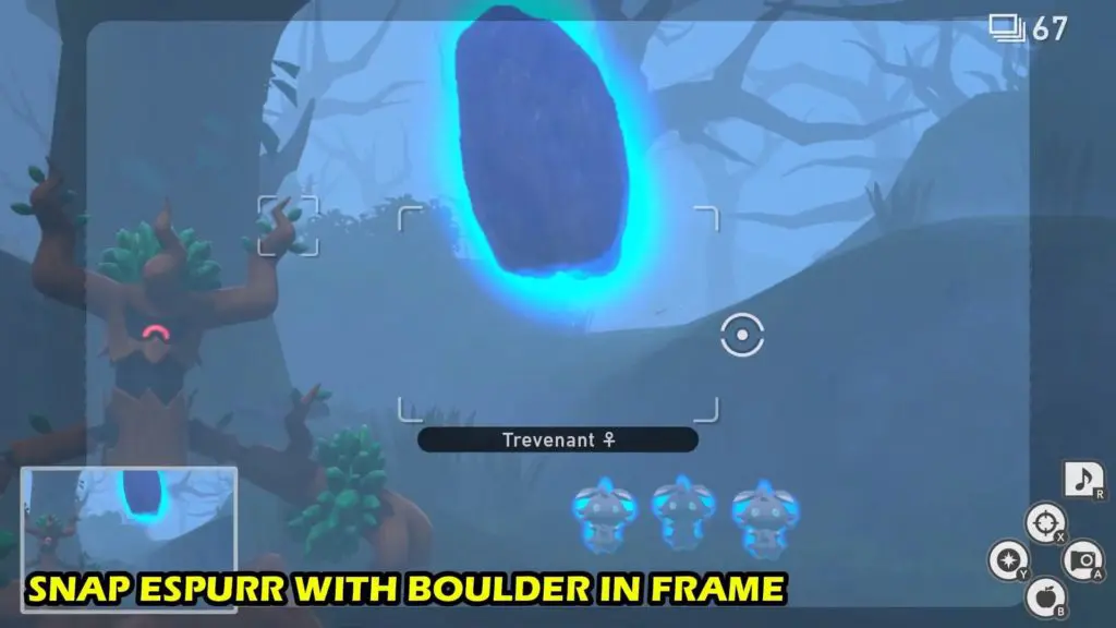 An Airborne Boulder Request: New Pokemon Snap Guide Post published:May 6, 2021 Post category:New Pokemon Snap How to Clear An Airborne Boulder Request | New Pokemon Snap Guide Guide:Visit Elsewhere Forest at research level 3. At the start of the course, you’ll see a Trevenant on the right side. Use Melody to move the Trevenant and access the Alternate Path. Take a Photo of the 3 Espurr levitating the Boulder to fulfill the request. RELATED: New Pokemon Guide & Walkthrough