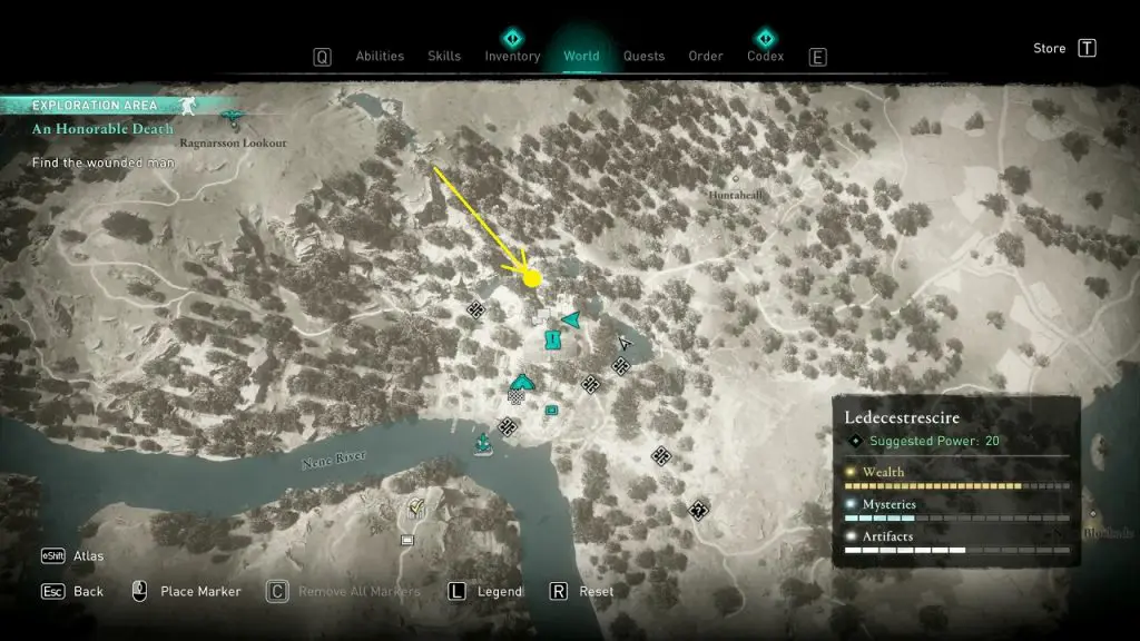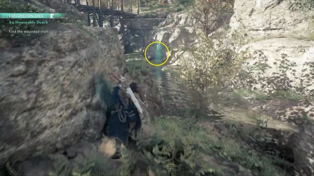 You will find the wounded man underneath a wooden bridge at the highlighted location, on the north portion of Ravensthorpe.