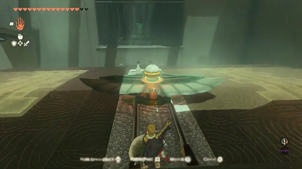 As you enter the shrine, grab a flying device and place it on the ground. Then pick up the ball there and place it on top of the flying device. Now place this flying device on the rails as shown in the picture below. It will carry the ball to the other side. Now glide to the surface across the gap. Pick up the ball from the flying device and place it into the hole there. This will open the iron gate ahead.