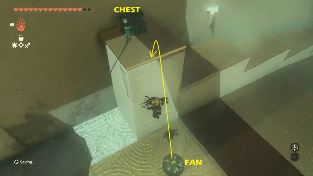 Proceed to the next area. Step into the wind to climb up the platform ahead. Then grab a fan and place it in front of the platform on the left side as shown in the picture below. Now use the wind to reach the top of the platform. Open the chest there to get a Strong Zonaite Spear.