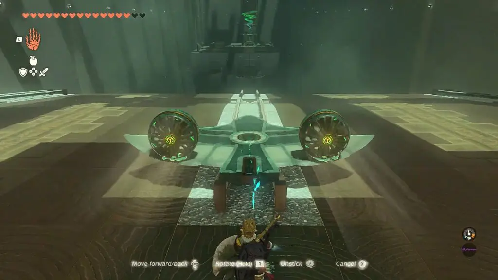 Jump down to the main platform. Grab a flying device and attach two fans at its back as shown in the picture below. Now place the flying device on the rails. Climb up the flying device and activate both fans. The flying device will now carry you to the other side, across the gap. Get the blessing there to complete the shrine.