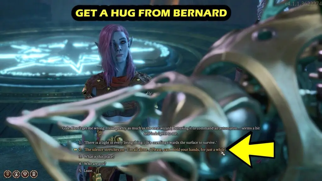 Finally, you can return to the top floor again to get a hug from Bernard after selecting the dialogue “The silence stretches on – I’m all alone. Please, can I hold your hands, for just a while?.