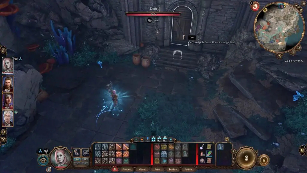 Interact with the door by picking the lock, casting a knock spell, or hitting it with a melee weapon until it breaks. Head inside the Arcane Tower with Sussur Bloom. (You are at Level 1)