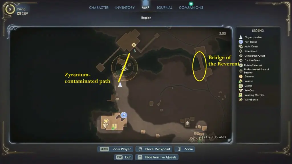 Travel to Skycutter A102, located in the northern part of the island. You can choose to reach the area by passing through the Zyranium-contaminated path to the west or by passing through the Bridge of the Reverent, which includes a fight.