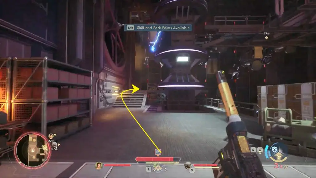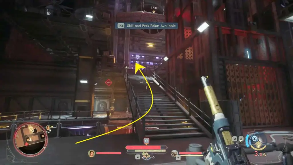 Now, go past the elevator and climb up the staircase leading towards Deck 2.