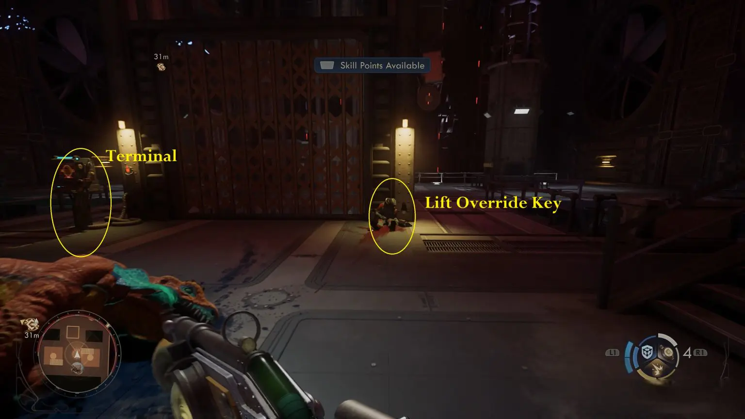 When you reach Deck 6, go to the elevator and pick up the Skycutter Lift Override Key from the corpse. Use the key on the terminal to the left to restart the lift. Then, fight off the waves of enemies until the lift arrives, and finally take it up to the terrace.