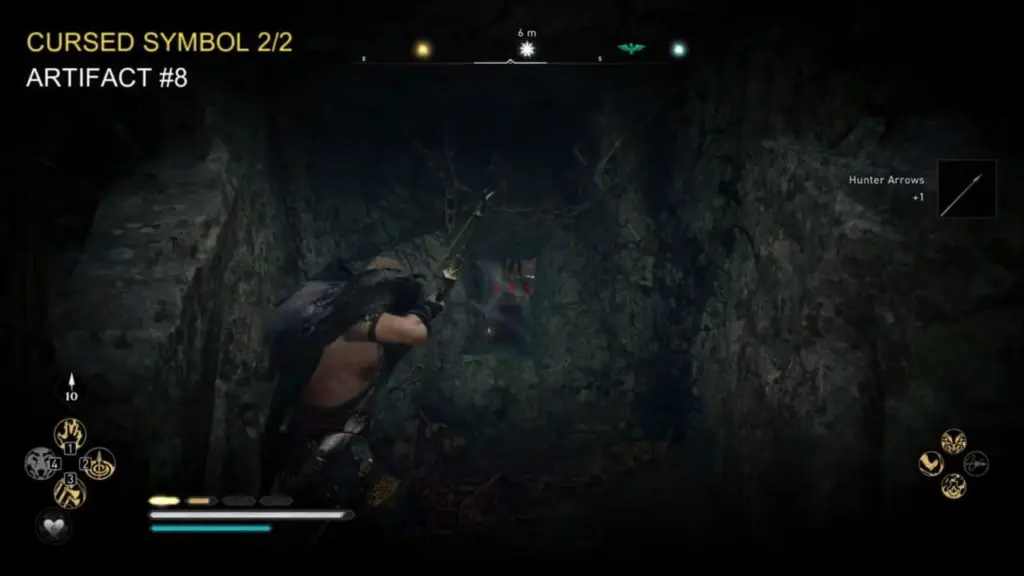 You can enter the cave area directly. First head back to the other side of the hill. You will find a small hole on the wall. Shoot an explosive arrow through it to blow up the wall on the other side. Reach the other side to reveal the artifact.