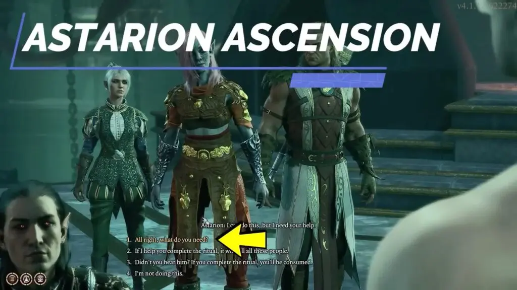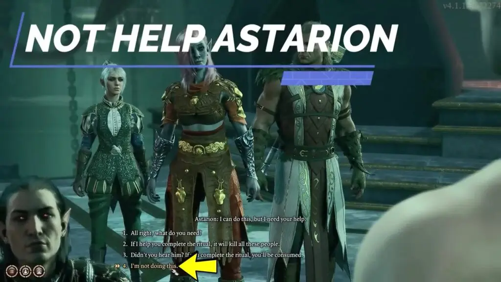 If you choose not to help Astarion with the ritual, use the conversation option to inform Astarion that carrying out the ritual will result in the deaths of thousands. Select dialogue #4 – I’m not doing this.