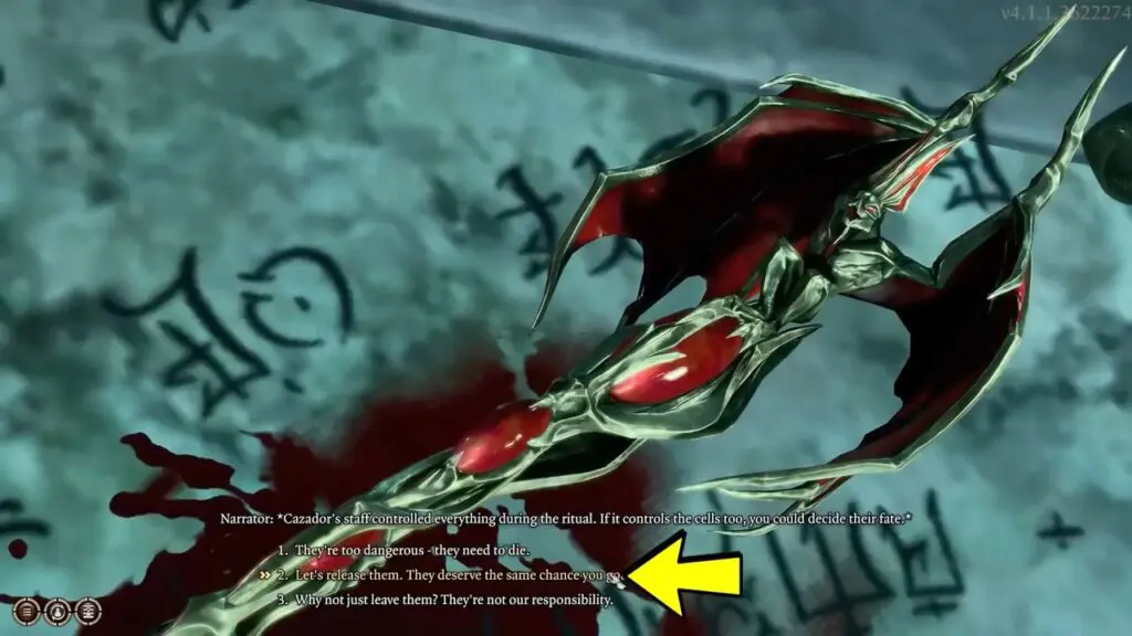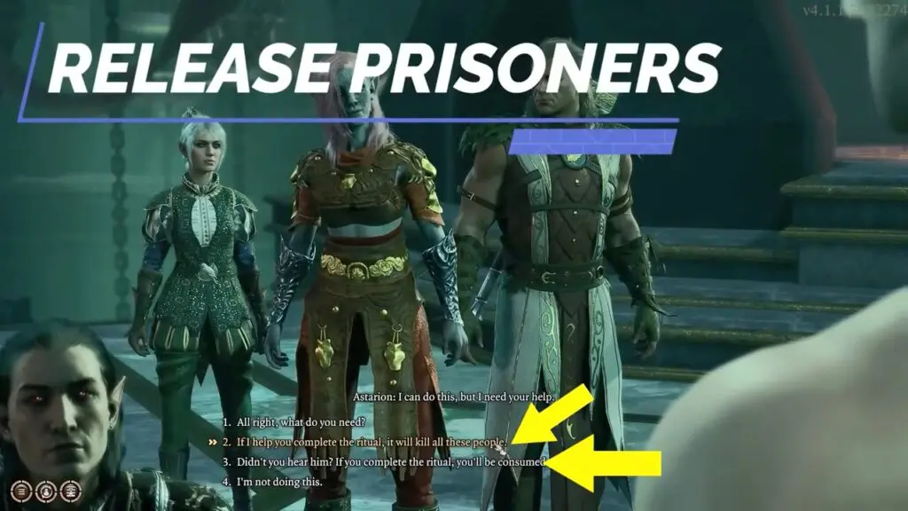 If you choose to release prisoners then Astarion will still try to convince you to help him with the ritual to gain power. Then, succeed in the Persuasion checks “I know you think this will set you free, but it won’t.“
