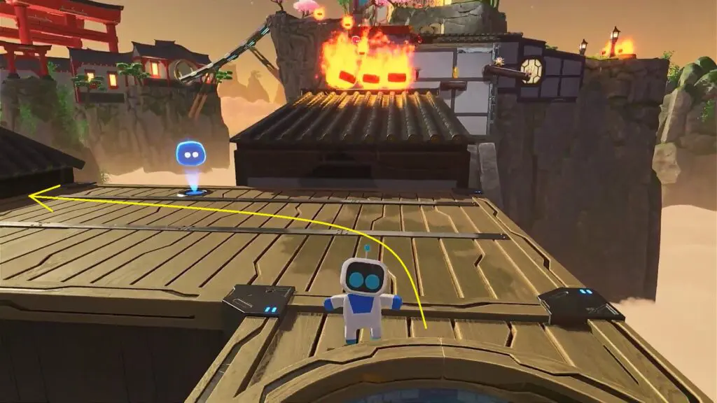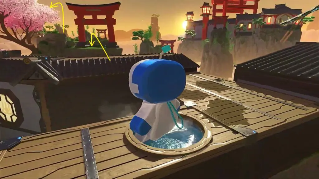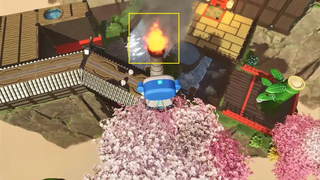 Progress in the Bathhouse Battle (Serpent Starway) level until you reach a courtyard. After getting Bot #4 & Puzzle Piece #2, climb up the wall to exit the courtyard. You will reach a checkpoint, with a burning roof ahead as shown in the picture below. Instead of taking the straight path ahead, go through the arch on the left side as shown in the second picture below. Then climb up the pink tree there.