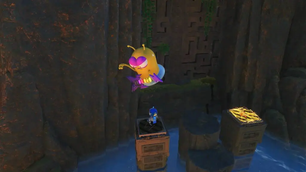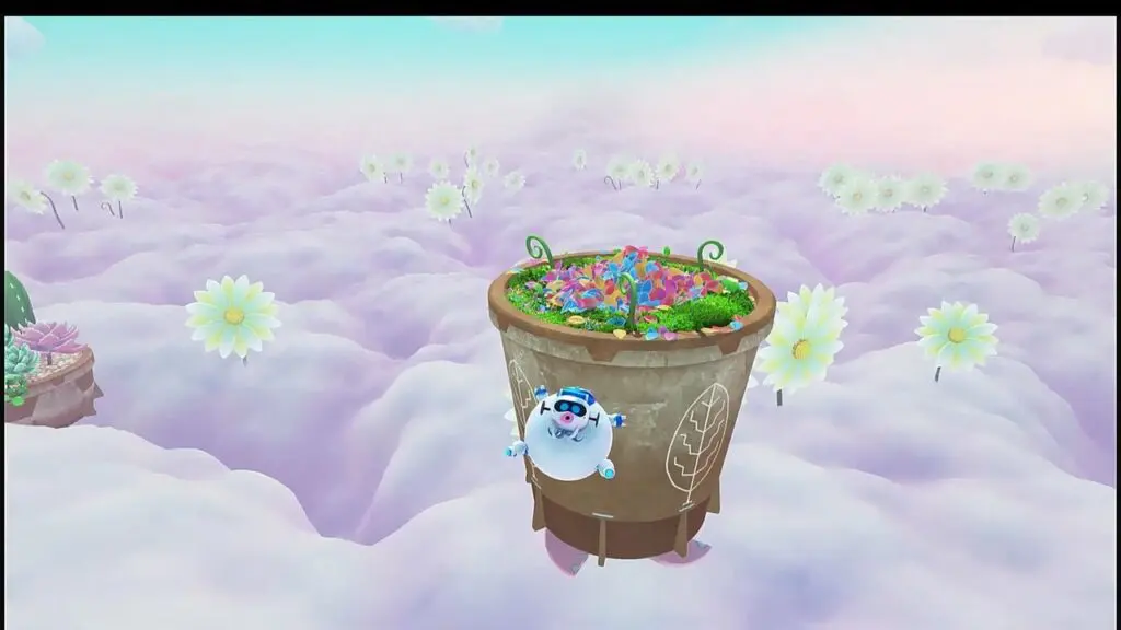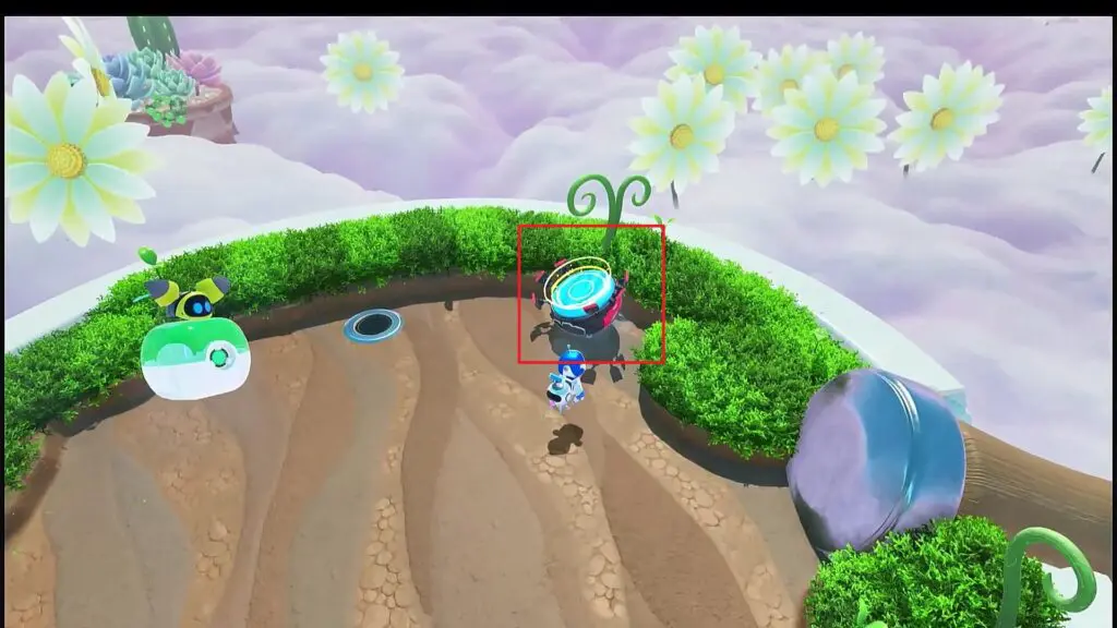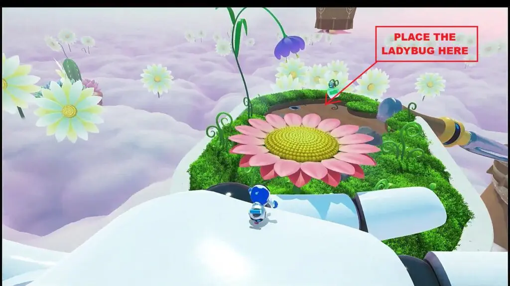 Start the Balloon Breeze level and soon you will get the Balloon Power-Up by opening a chest on the hand of a giant robot. Then jump back to the previous area. Hit the ladybug there to make it a trampoline. Then place the trampoline at the edge of the area as shown in the pictures below.