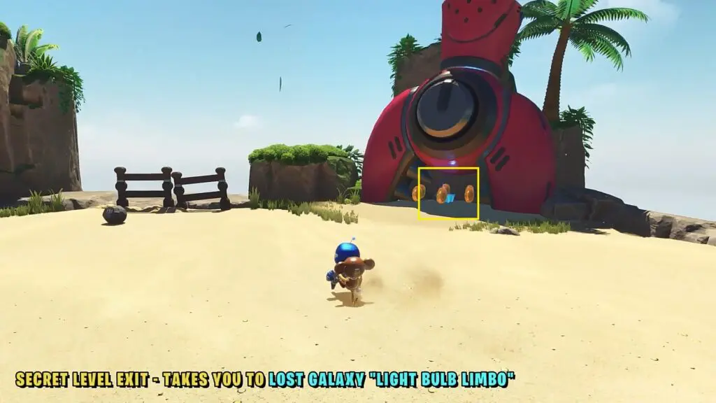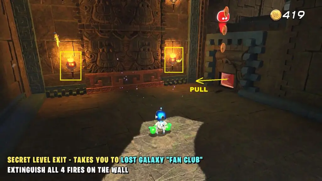 On the temple wall, you will see 4 torches. You need to extinguish the four fires for the secret level exit to appear. The two fires at the bottom can be extinguished easily. For the two torches at the top of the wall, pull the red button on the right side of the wall as shown in the second picture below. This will make a ladybug come out. Hit it to get a trampoline. Then use the trampoline to jump up and extinguish the fires. This will make the wall with the torches move. revealing a secret level exit, Lost Galaxy “Fan Club”.