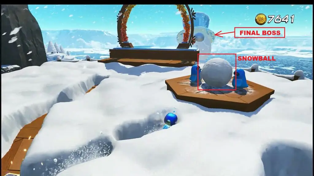 Proceed in the Frozen Meal level until you reach the finish line as shown in the picture below. Before crossing the finish line to reach the final boss (Giant Snowman), you need to find the secret level exit. You won’t be able to reach there after you cross the finish line.