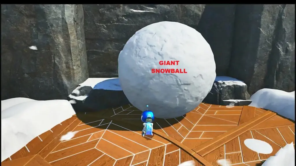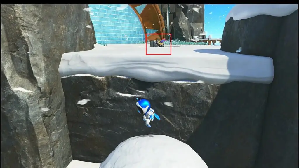 Jump on top of the giant snowball. From there, climb up the platform ahead as shown in the picture below. There you will find some wires sticking out from the ground. Pull the wire and a button will come out. Press the button to get a Dual-Sense Controller. Use the controller to destroy the ice wall ahead as shown in the second picture below. this will unlock the secret level exit.