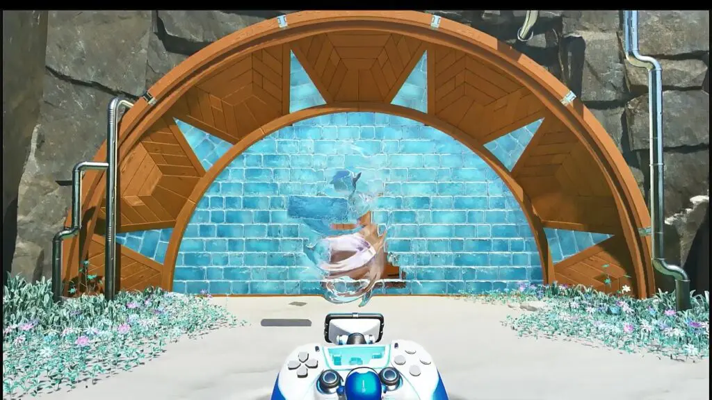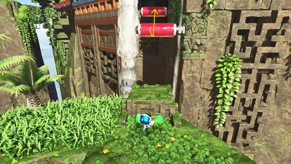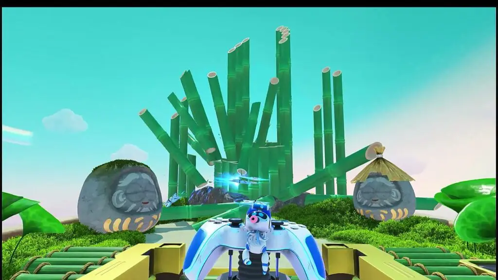 Reach the new flowerpot and stand on the red button there. This will make a dual-sense controller come out. Use it to slice the bamboo ahead as shown in the picture below.