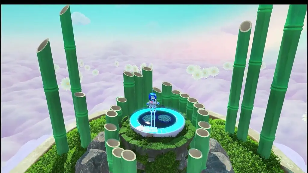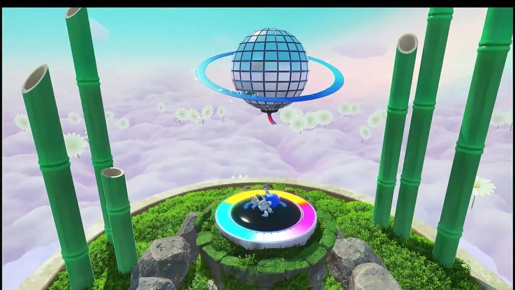 When the bamboos are sliced, you will see a black circle surrounded by a ring. Hit the ring with foot lasers all around its perimeter as shown in the picture below. This will make the globe come out as shown in the second picture below. Pull the wires coming out of the globe to reveal the Lost Galaxy entrance.