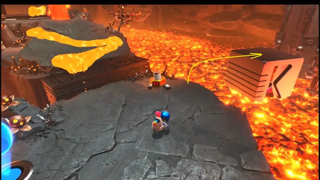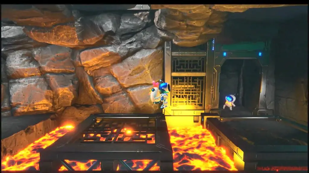 In the next area, move to the right side where a giant metal block is rolling in the lava. Pull the chain to create a platform, then climb to the top to rescue the bot.