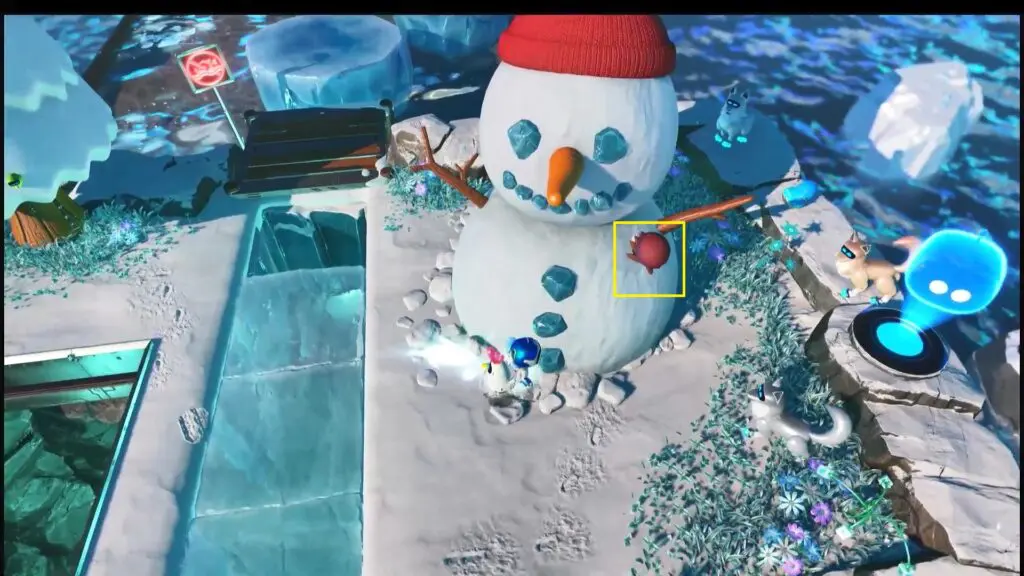 Now pull the chain on the right side to reveal a snowman. Bot is hanging from the arm of the snowman.
