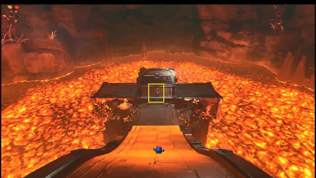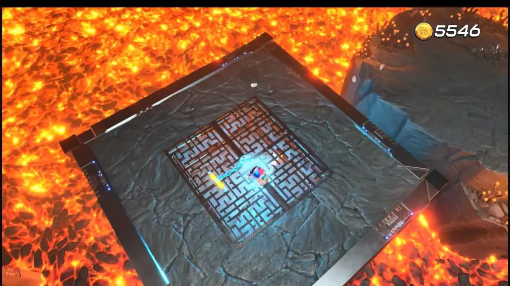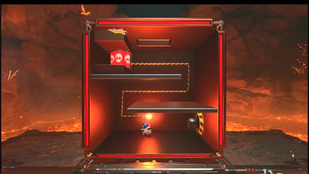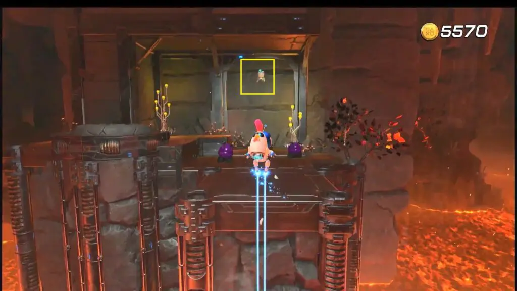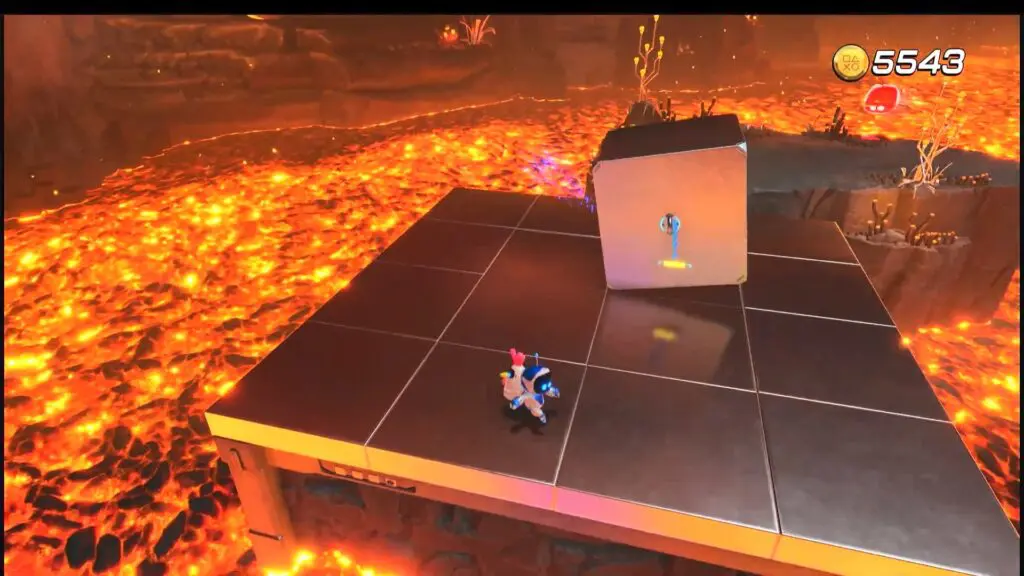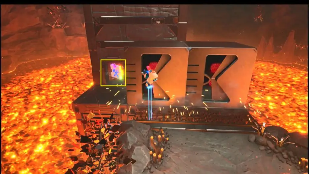 Continue forward in the level until you reach the lava cave. Pull the chain on the giant metal block to break the flat platform. (This is second rotating block)