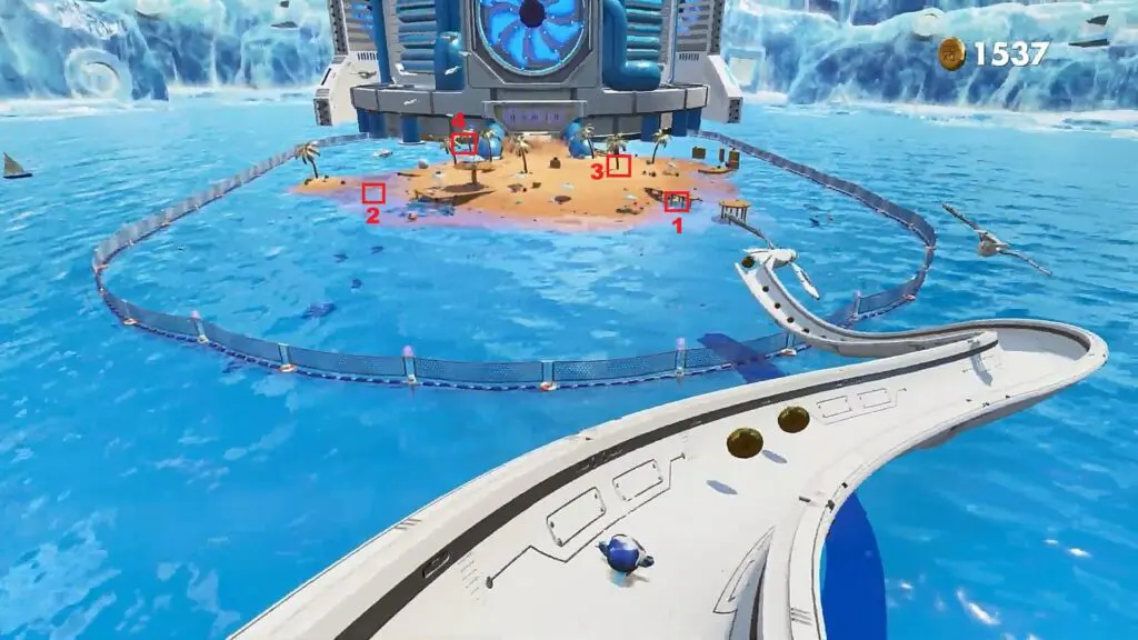 Go to the right side of the area and remove the shell underneath the blue pipe to reveal a hidden Steering Wheel as shown in the picture below. Step on the Steering Wheel and press the “Option” button. This will open the game map. Your objective is to start driving from the Bot Beach and Return to the Bot Beach. Take the path marked by yellow lines in the second picture below. Press UP-LEFT-DOWN-DOWN-LEFT-DOWN-DOWN-RIGHT-UP-RIGHT-DOWN-RIGHT-UP-UP-RIGHT-UP-LEFT-LEFT to complete the objective and rescue the special bot.
